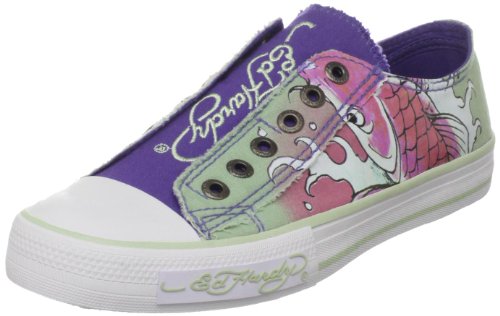Your swag will be all the way turnt up in the Ed Hardy Chaud shoes. These shoes feature a canvas upper with metal eyelets, laceless design, and Ed Hardy's signature tattoo-inspired prints. Fabric lining and a padded fabric footbed offer soft comfort. The Vulcanized rubber outsole gives sure traction and durability.Ed Hardy Women's Chaud Fashion Sneaker Specifications