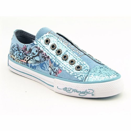 Glam it up with shining style in the Ed Hardy Lowrise Glitter sneakers. Features a fabric upper in a laceless, slip-on style with dual rows of eyelets, metallic accents, and Ed Hardy's signature tattoo designs. Fabric lining and a padded fabric footbed. Rubber outsole gives sure traction and style.Ed Hardy 11FLR304W LR Glitter Shoes Aqua Womens