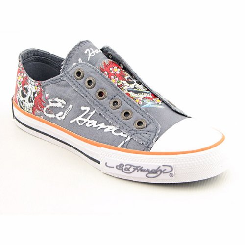 Pick up the daring Ed Hardy Lowrise Manning shoes. These shoes feature a canvas upper with a laceless design and bold tattoo-inspired prints. Canvas lining lends soft comfort. The rubber outsole is long-lasting and grippy.Ed Hardy 11FLR506W LR Manning Shoes Gray Womens