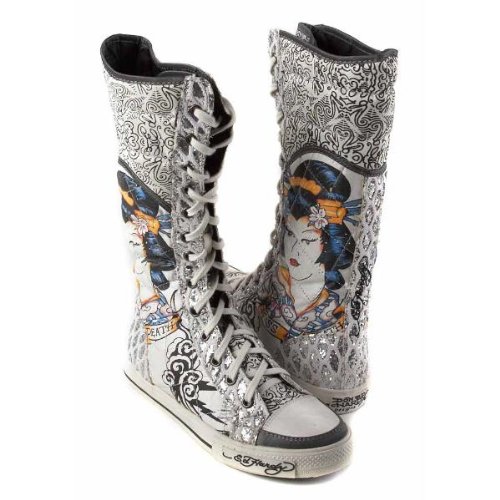 Ed Hardy Shins in Silver Glitter.Lace-up high top sneakers with original Ed Hardy graphics. Canvas upper, decorated with glitter and mesh netting, vulcanized rubber construction. These shoes are available in women's full sizes only 5-10. If you are in between sizes please order the next whole size up.Ed Hardy Women's Shin Boots